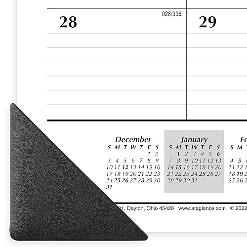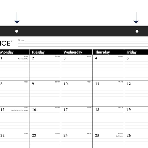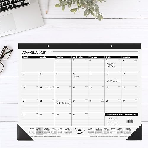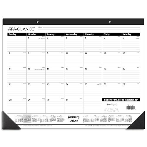 Keep track of important deadlines, special events and more with clear organization and unique style. The AT-A-GLANCE Monthly Desk Pad covers 12 months from January 2024 – December 2024 with Julian dates. Plan your schedule without fear of distracting ink bleeding. Our improved, high-quality paper is designed for superior ink bleed resistance, which keeps plans neat and legible. Great for long term planning, each month features ruled daily blocks, space for notes and a full year of reference calendar blocks. Pages measure 21-3/4″ x 17″. Daily block size measures 2-15/16″ x 2-3/8″. Expand your organizational skills with special features, including a perforated pages, 2 black corner protectors and holes for optional wall hanging.
